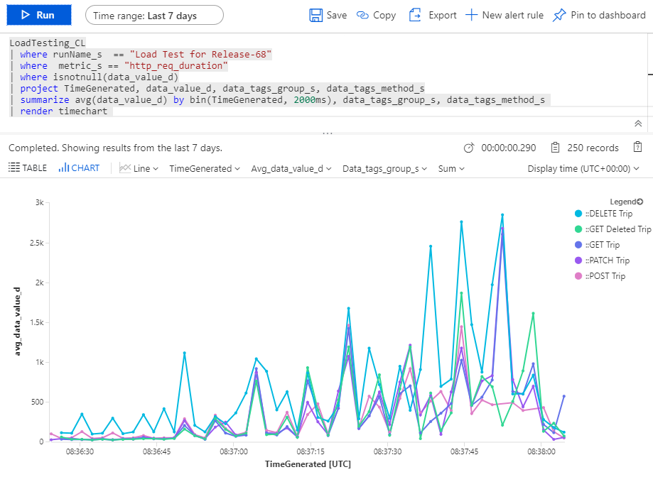 TimeGeneratedfield that all entries have. This was very useful as the k6 data had the timestamps I needed and the microsecond level timing data was critical