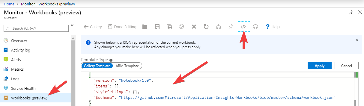 You can import this by going to Azure Monitor in the portal, creating a new workbook, then clicking the code icon on the far right of toolbar. Then simply paste the JSON in, replacing what is there