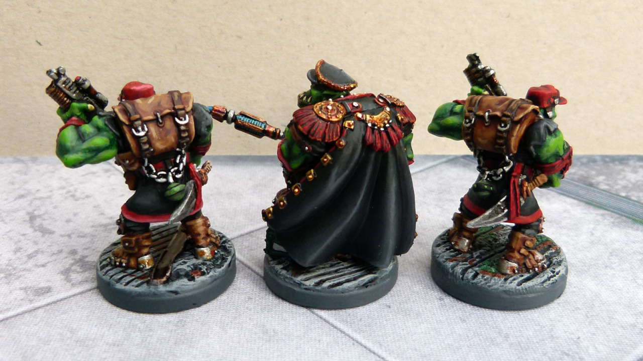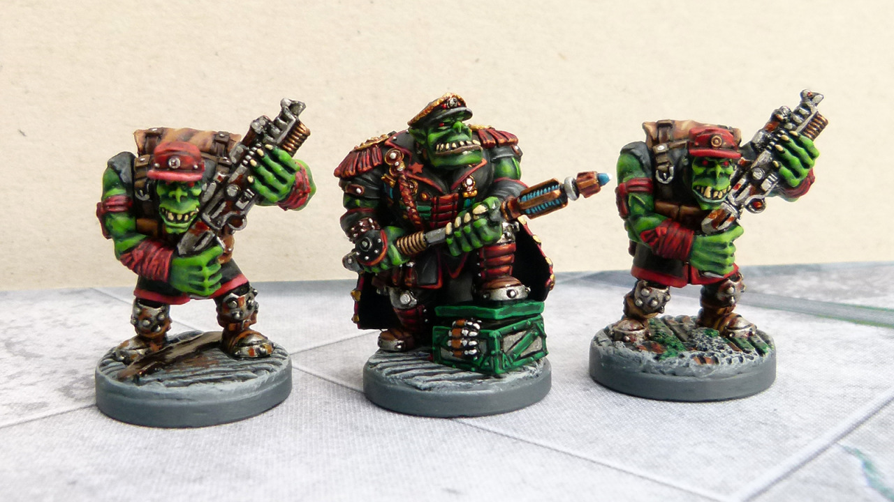 First issue was the damn mould lines and the fact they are cast in restic so that was a bigger hassle than it needed to be. Secondly they are multi-part, so I left the arms off and painted them separate, which solves one problem but gives you another in terms of extra fiddle. I went for a classic orcish colour scheme of black & red, they ended up with more red than I intended but it’s OK. The paint job on the two troopers is quite rough in places, don’t think the washes on the arms worked at all. The number of pouches and straps and “bits” they have is stupid, especially for warlike & primitive race like orcs. The commander came out better, I didn’t use a wash on the flesh, just highlighted it up in 3~4 stages from a dark green and was pleased how the medals and other details on his jacket turned out.