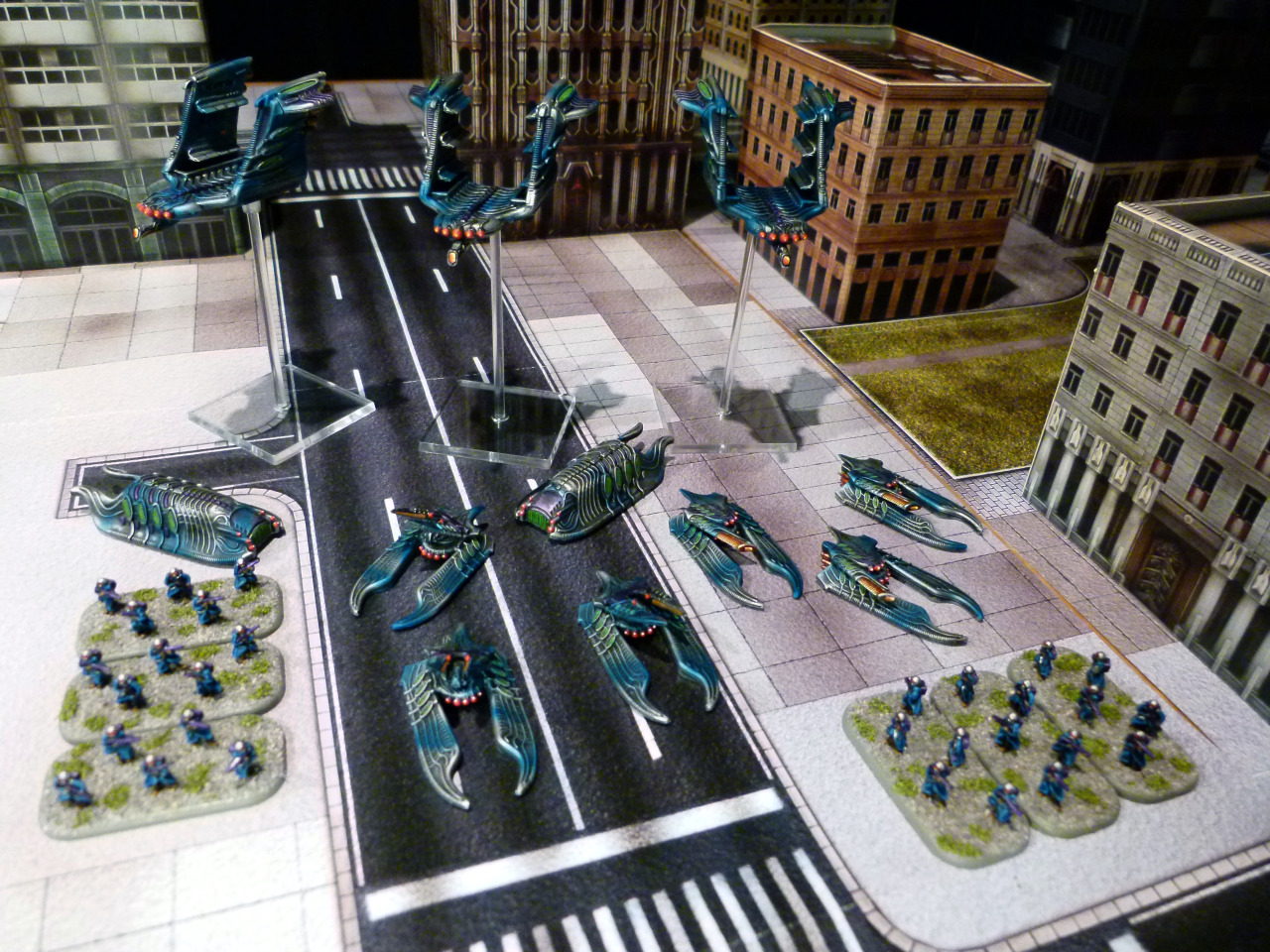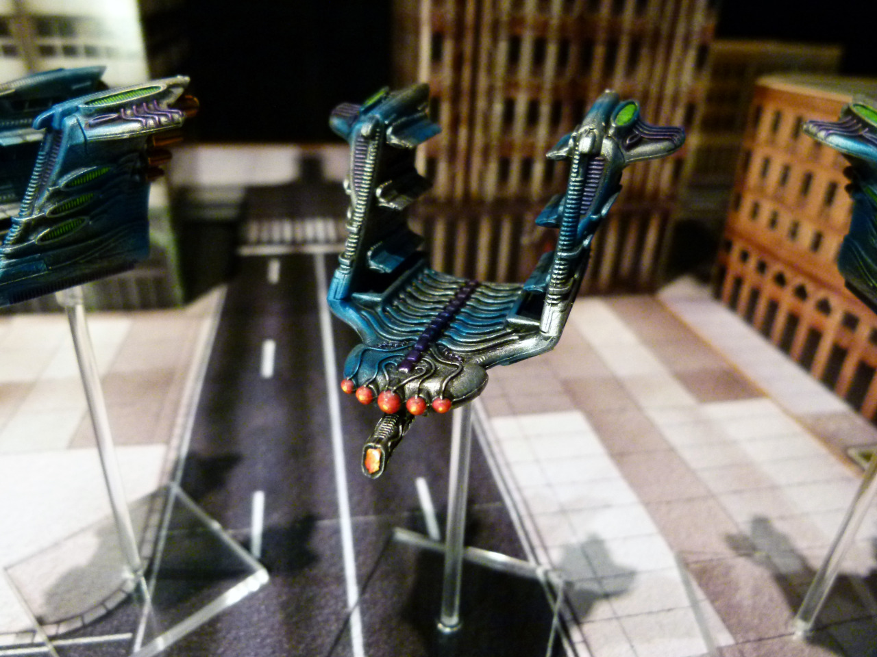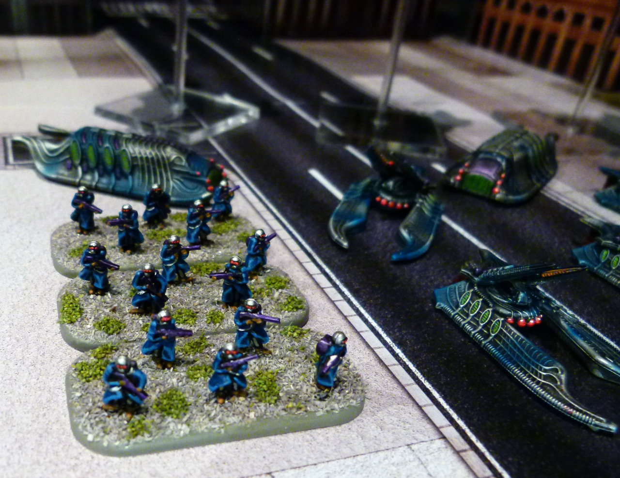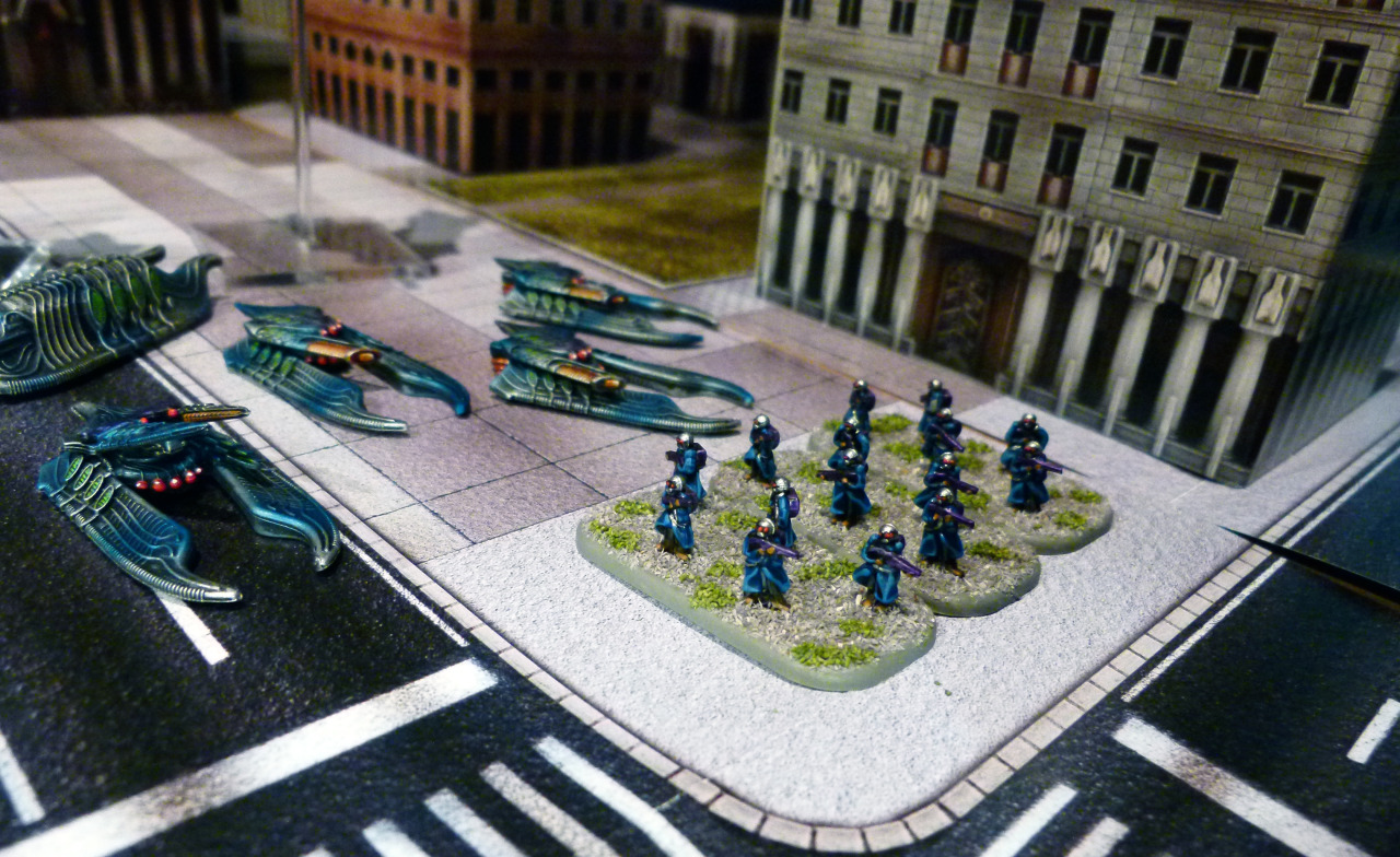 Finished the Scourge from the Dropzone Commander starter set. Enjoyed painting these. Although the paint job was 98% simple metallics, I think it’s pretty effective. They’ve come out way more colourful than I anticipated, but that’s OK. The infantry are terrible models (in contrast to the excellent sculpts on the vehicles) so I just did my best I could with them. Scenery is also from the starter box, it’s all card & paper but really not that bad. Now to get a game!