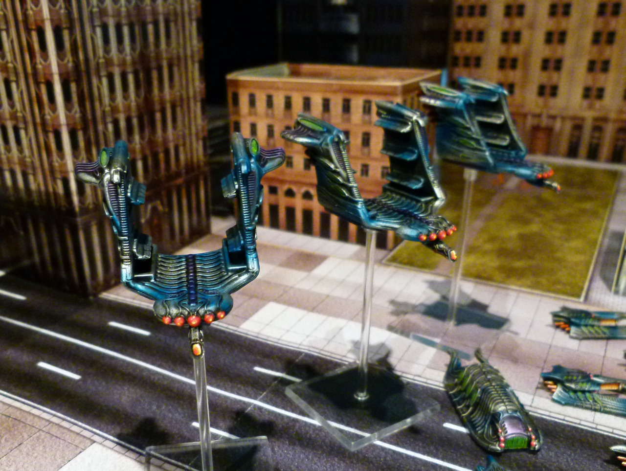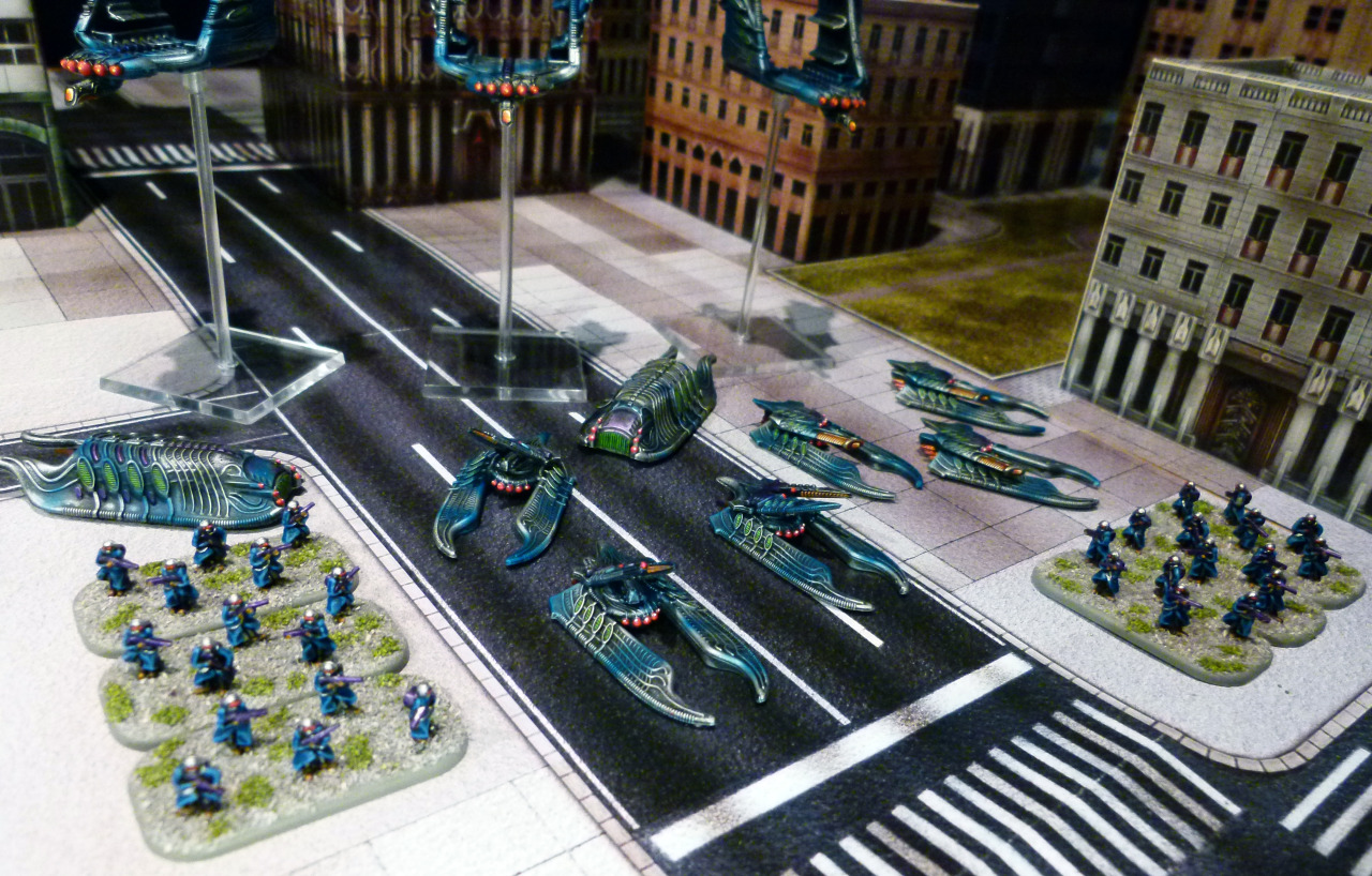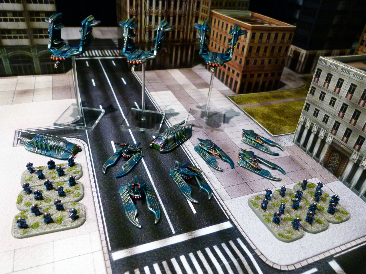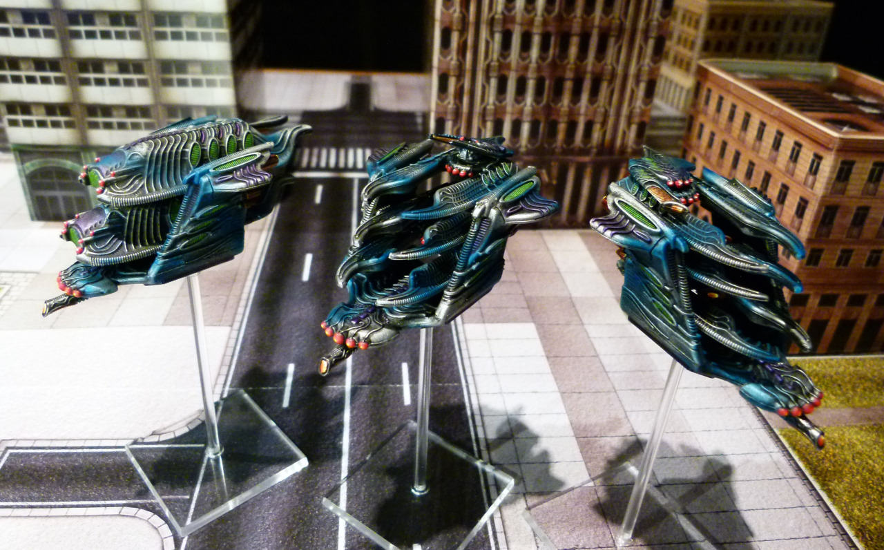 Finished the Scourge from the Dropzone Commander starter set. Enjoyed painting these. Although the paint job was 98% simple metallics, I think it’s pretty effective. They’ve come out way more colourful than I anticipated, but that’s OK. The infantry are terrible models (in contrast to the excellent sculpts on the vehicles) so I just did my best I could with them. Scenery is also from the starter box, it’s all card & paper but really not that bad. Now to get a game!