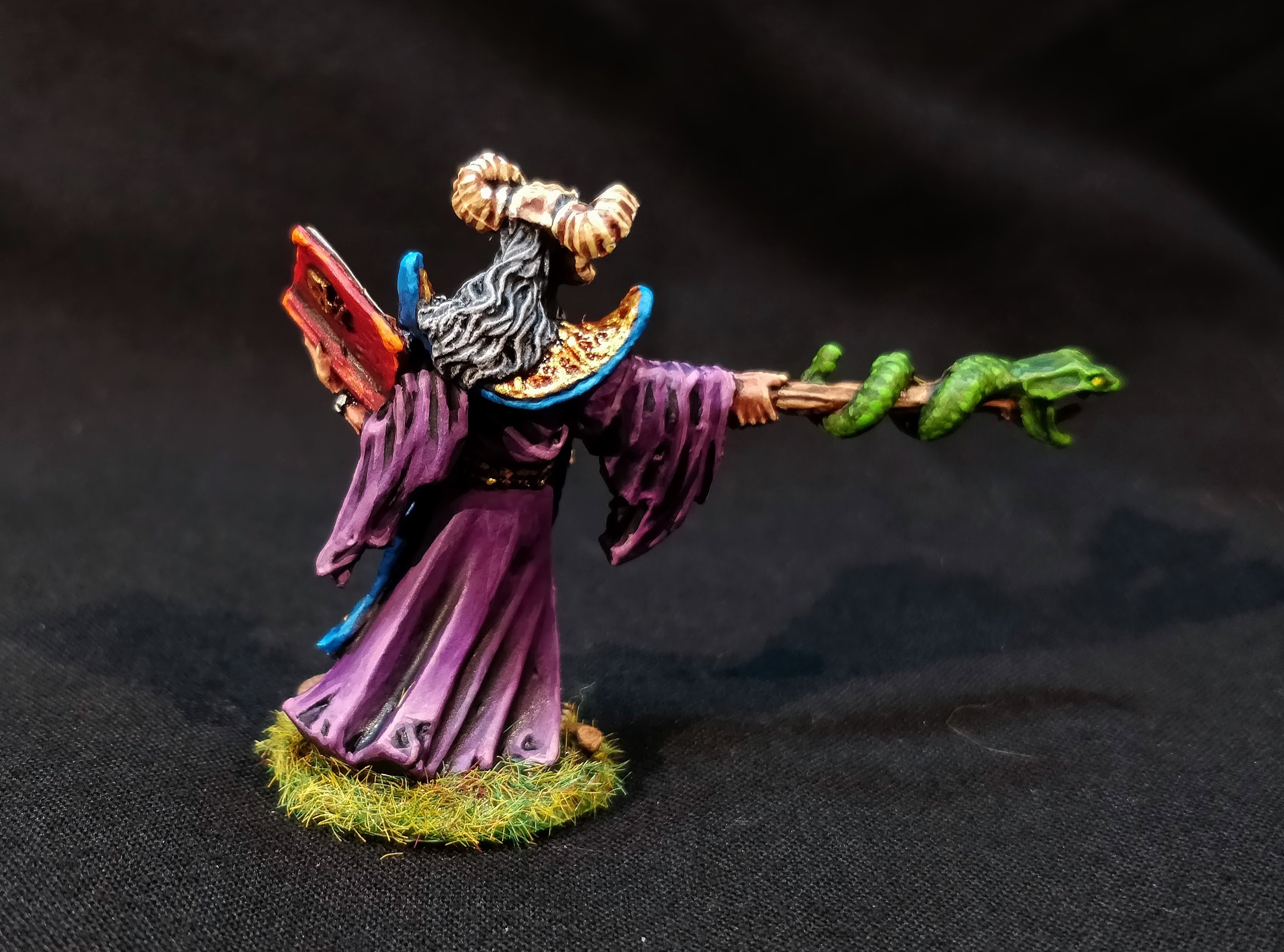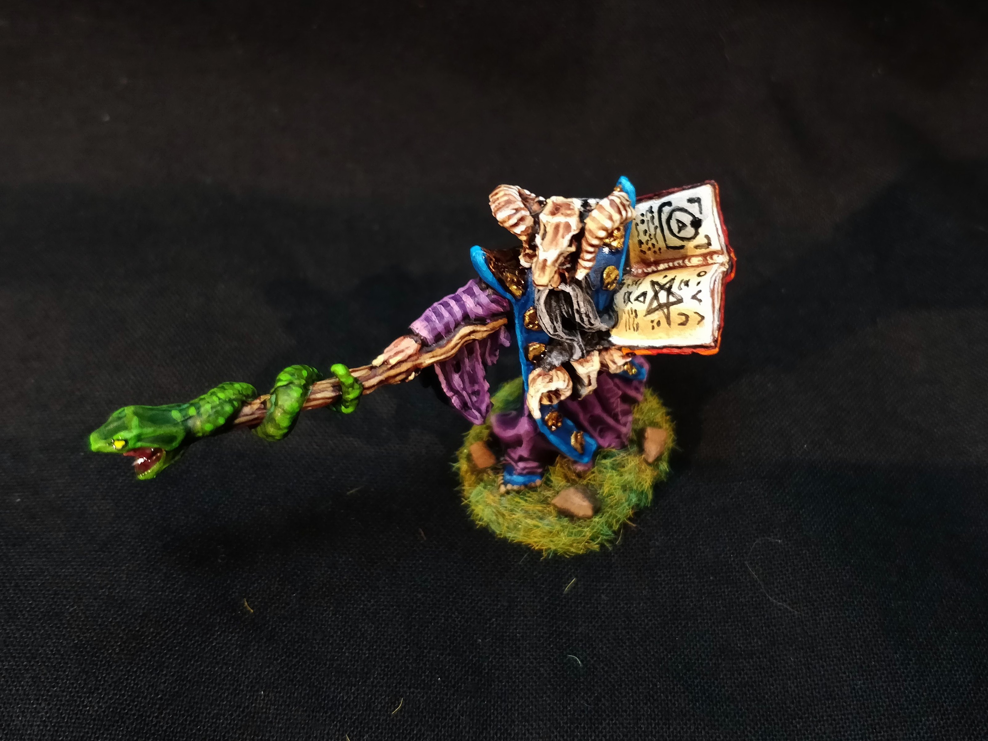 I did like the pose/sculpt which is definitely a fun nod to Tim the Enchanter from Monty Python. Not much to say about the paint job really, the bones/horns are scruffier than I would have liked but lack of fine detail on the model held me back. There was a nice big open book, so I did put the effort in to make it look suitably spellbooky and mystical, filled with runes and pentagrams